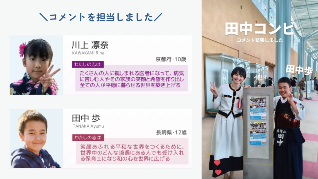 今回は、田中歩くん(12歳)と川上凛奈ちゃん(10歳)のコメントを担当しました。